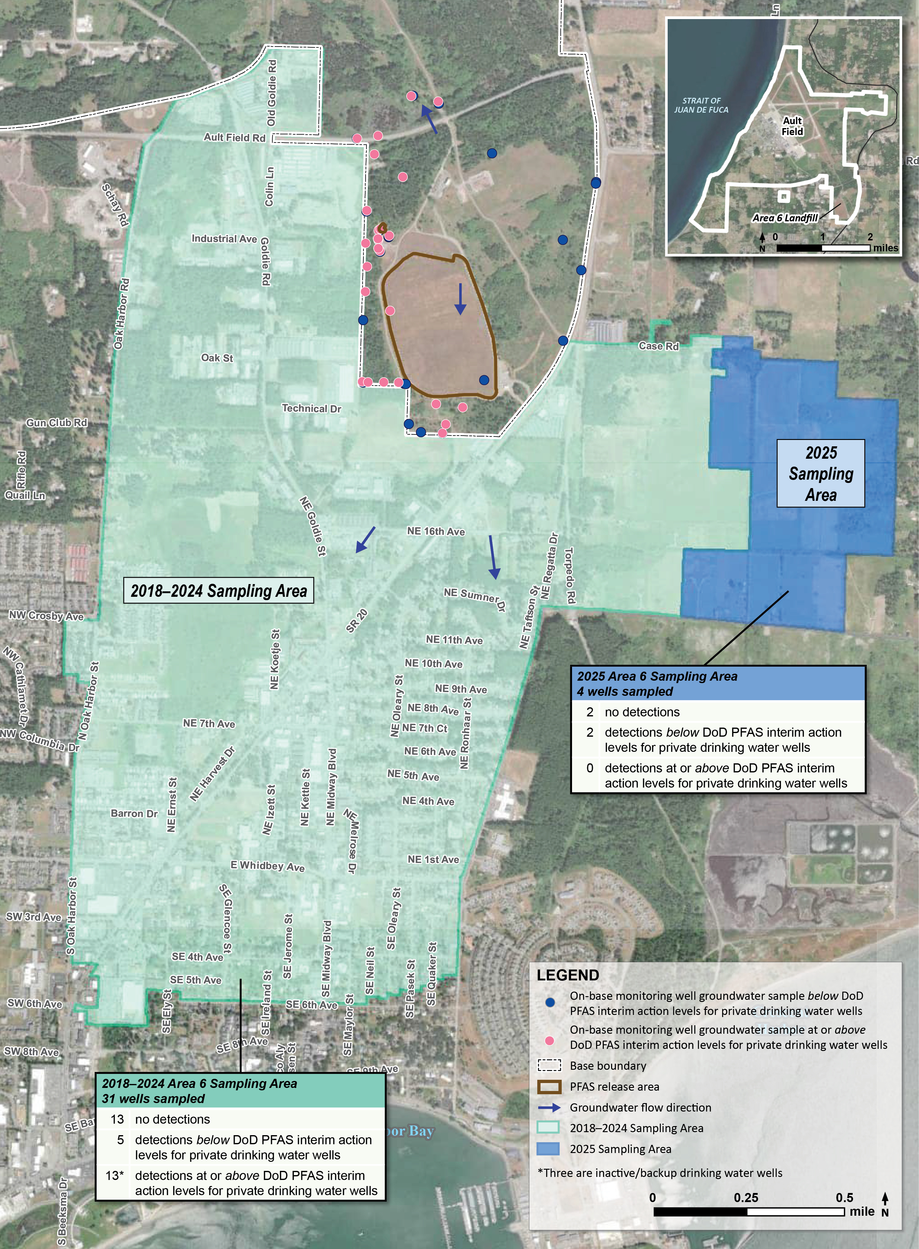 From 2018 through 2024, the Navy sampled 31 drinking water wells near the Area 6 Landfill based on information available about potential PFAS releases. PFOA and/or PFOS were detected in nine drinking water wells above 70 parts per trillion (ppt), the DoD interim action level at the time. In 2022, the Navy connected six properties to the City of Oak Harbor water system. The Navy will continue to provide bottled water for drinking and cooking or a kitchen sink filtration system to the remaining five properties served by three wells with detections of PFOA and/or PFOS above 70 ppt until an enduring solution can be implemented.