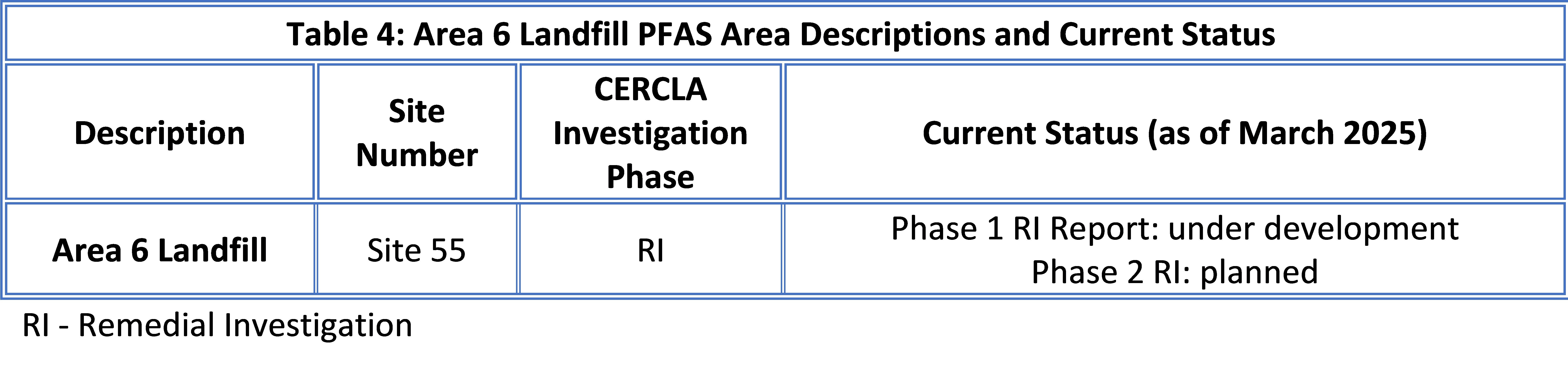 A PFAS Preliminary Assessment (PA) was finalized in 2018 that identified 35 areas (including the Area 6 Landfill) where releases of PFAS may have occurred, and subsequently conducted a Site Inspection (SI), which was finalized in September 2020. Based on the SI results, a Remedial Investigation is underway to understand the releases better.