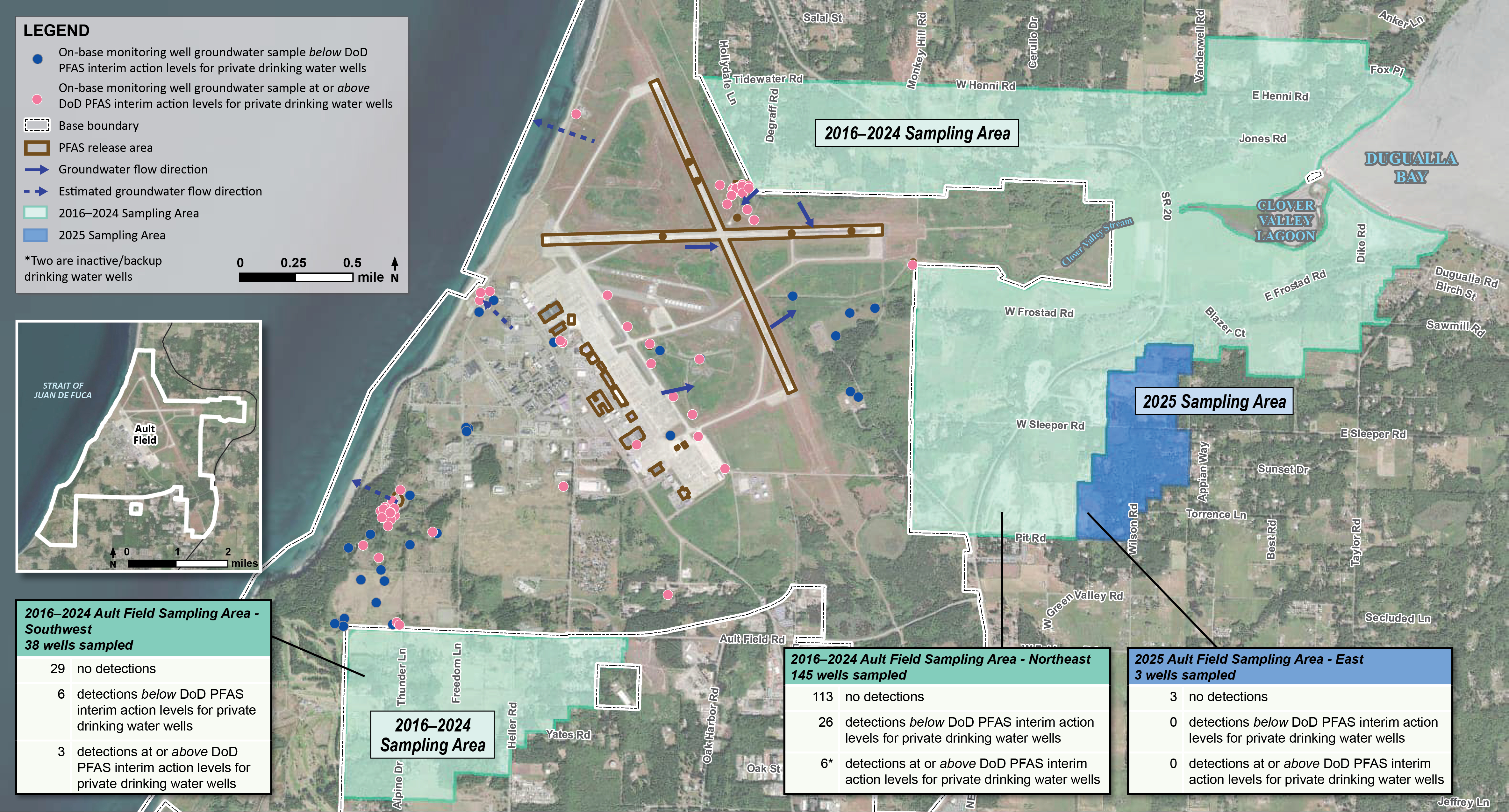 Certain PFAS have been detected in groundwater near Ault Field above the DoD PFAS interim action levels for private drinking water wells (Figure 1). As a result, multiple sampling areas have been established in the direction that groundwater flows away from the locations of these detections. The Navy continues to offer sampling to all property owners whose property is within the sampling areas (Figure 1) and whose drinking water is supplied by a drinking water well.