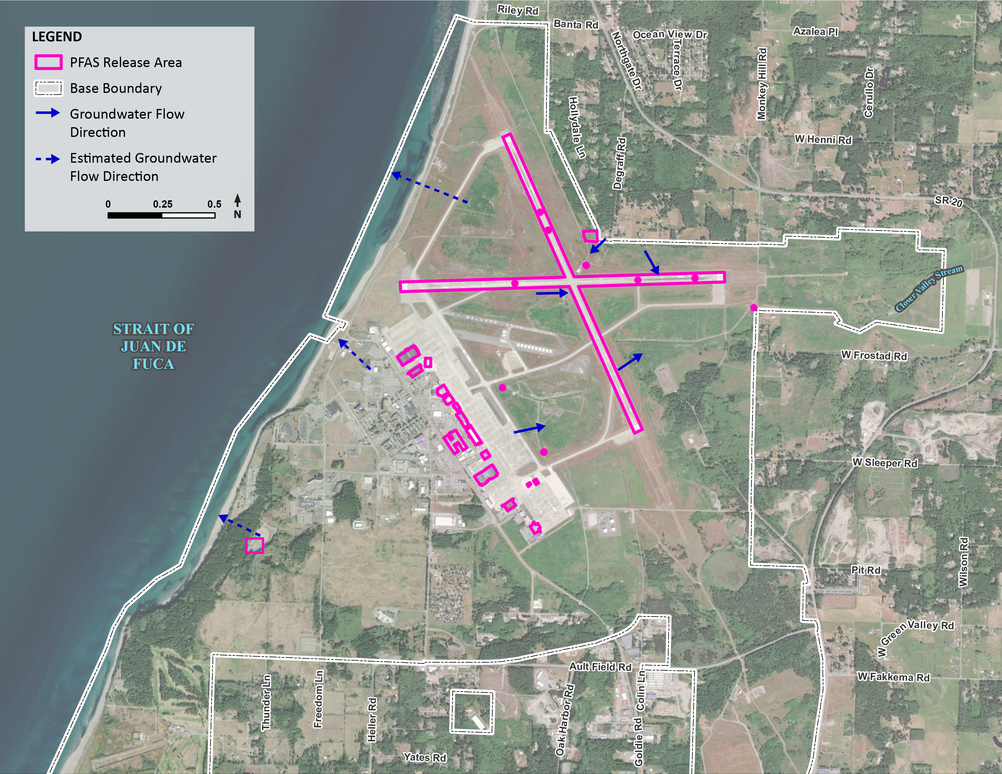 The most common activity that could have resulted in the historical release of PFAS to the environment at Ault Field (Figure 1) is the use of firefighting foam (specifically, aqueous film-forming foam, or AFFF) for testing, training, firefighting, and other life-saving emergency responses. Because of this historical use, PFAS are present in the groundwater at Ault Field and have been detected in nearby off-base drinking water wells in the direction that the groundwater flows away the base.