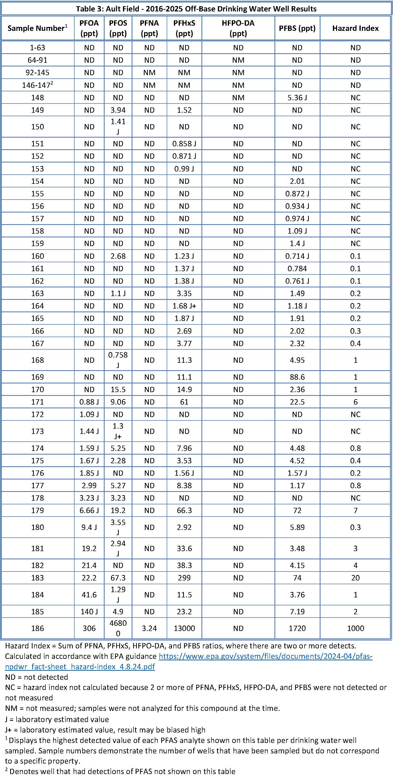 Drinking water well sampling was conducted again in early 2025, the sampling included new wells and many resampled wells. During this sampling, there was one new exceedance of the DoD PFAS interim action levels for private drinking water wells. The Navy is offering kitchen sink filtration systems to the users of this drinking water well until an enduring solution can be implemented. To date, 186 wells have been sampled near Ault Field (Table 2) including the 177 wells that were sampled from 2016 through 2024. Table 3 presents the PFAS results.