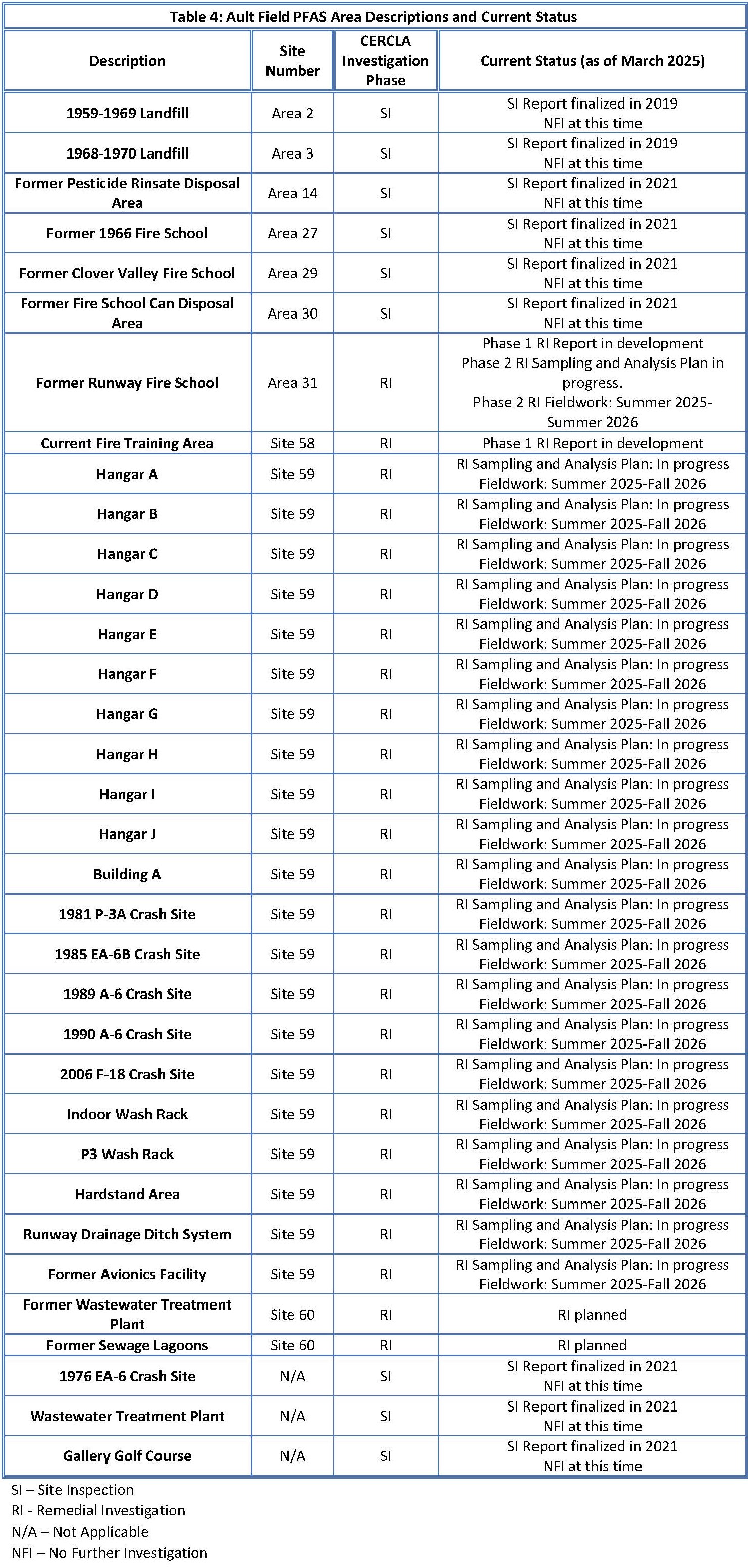 The PFAS release areas investigated at Ault Field are depicted on Figure 2; Table 4 lists the release areas investigated during the SI and RI along with the current status. The Navy will continue on-base PFAS investigations following the CERCLA process and evaluate if additional actions are needed. All final documents are posted to the Navy’s CERCLA Administrative Record available at https://go.usa.gov/xh2Rd.