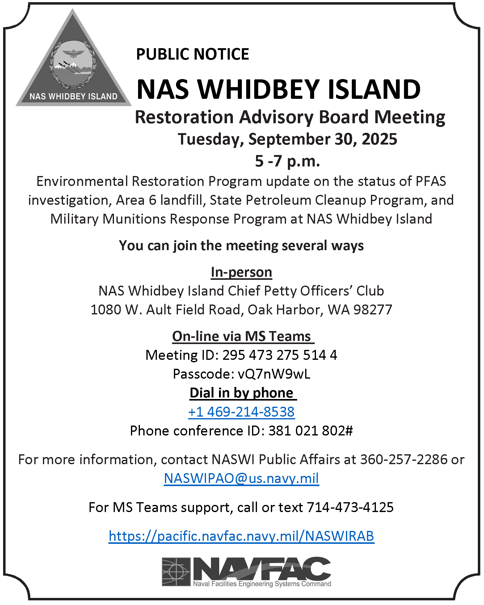 A Restoration Advisory Board (RAB) is an advisory group that includes community members and representatives of the U.S. Navy, U.S. Environmental Protection Agency, Washington State Department of Ecology and local government organizations that meet on a regular basis (typically 1-2 times per year) to discuss and learn about the Environmental Restoration Program (ERP) at Naval Air Station (NAS) Whidbey Island, where the Department of Defense/Navy has the responsibility to implement the environmental cleanup. RAB meetings provide a forum for discussion and exchange of information about the ERP. RAB meeting topics include ERP updates on the status of per-and polyfluoroalkyl substances (PFAS) investigations, Area 6 Landfill, State Petroleum Cleanup Program, and Military Munitions Response Program.