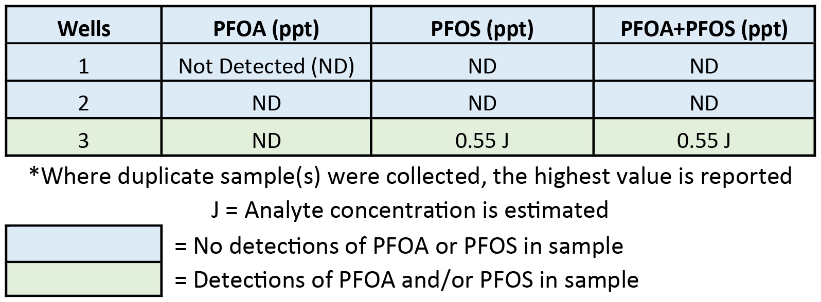 In June 2023, the Navy team initiated the sampling of drinking water from wells within the designated sampling area near NBK-Manchester (Figure 2). Table 1 summarizes the drinking water sampling results to-date. Table 2 presents the PFOA, PFOS, and PFOA+PFOS results. The Navy called each property owner and tenant upon receipt of their preliminary results to let them know if their water contained PFOA and/or PFOS above or below 70 ppt. Out of respect for the privacy of the property owner and tenant, individual results are provided only to each property owner and tenant.